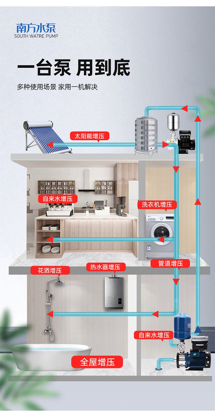 南方CHME系列臥式智能恒壓變頻泵采用了變頻調速及自動化控制相結合的技術,配合高效節能的CHM非自吸輕型臥式多級離心泵。整機主要由CHM泵、控制器、傳感器、壓力罐、五通止回閥及軸向抗震壓力表等組成。具有性能穩定、高效節能、全自動智能控制、低噪音、耐腐蝕、結構緊湊、外形美觀、體積小、重量輕等特點。